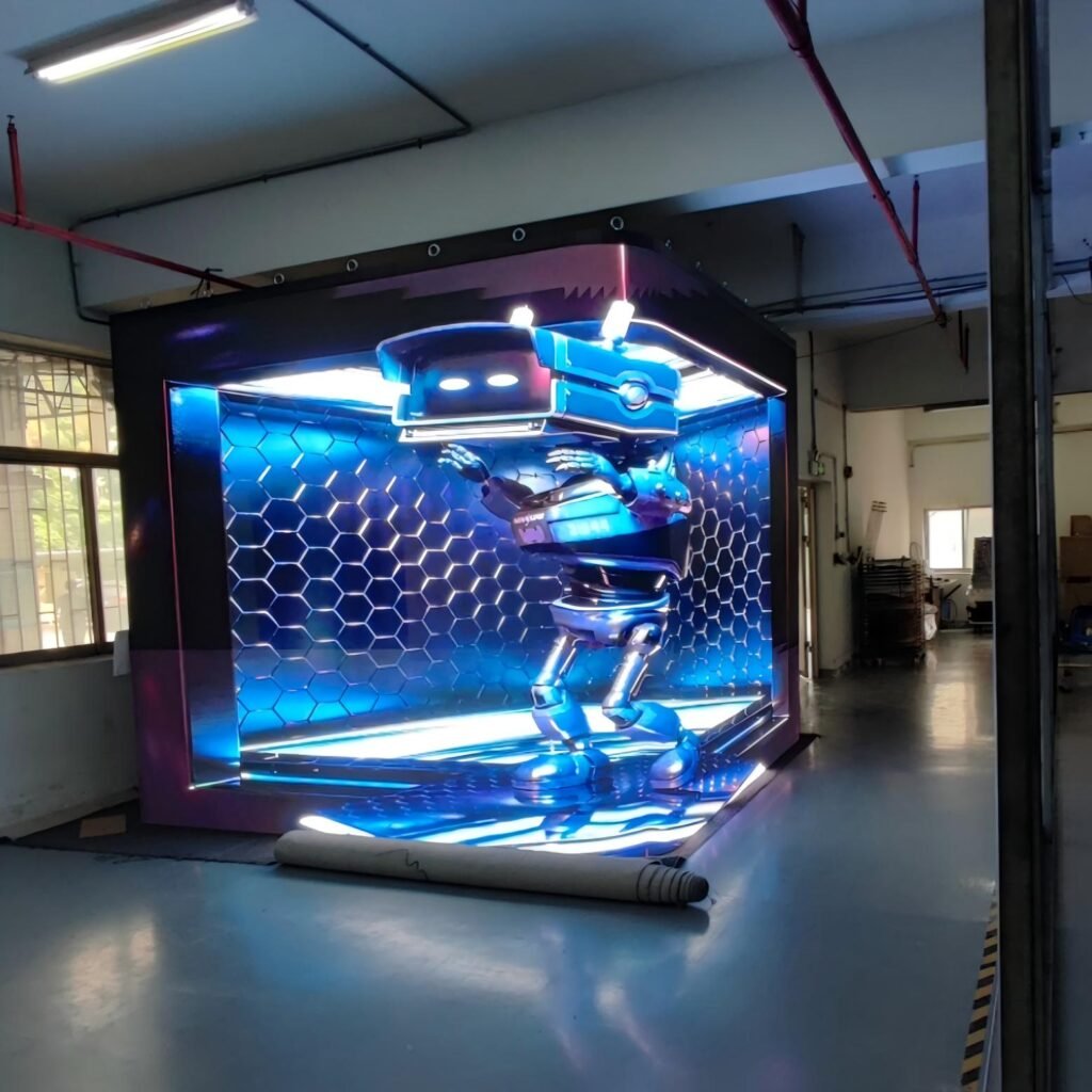 Large-scale LED installations that use dual-sided 90° corner designs to produce realistic 3D illusions for digital billboards.