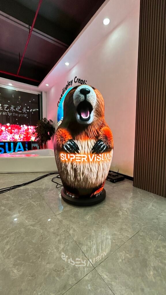 This project involved the design and installation of a groundhog-shaped LED pillar screen for a themed entertainment venue, combining creative storytelling with cutting-edge display technology. The pillar stands approximately 2.5 meters tall and replicates the distinctive features of a groundhog in 3D form, crafted using flexible LED modules and a custom internal frame to ensure a seamless curved surface.
